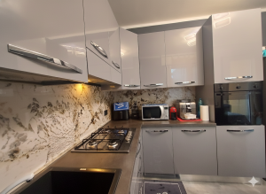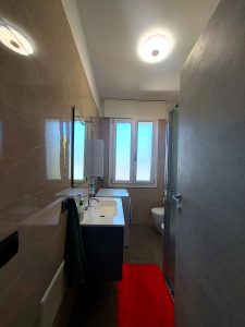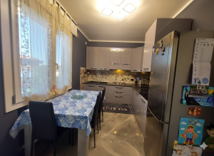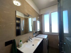 A sinistra dell’ingresso si trova invece la cucina di circa 11 mq, separata e moderna, anch’essa con accesso ad una terrazza di pari dimensioni dell’altra, affacciata però sul cortile interno condominiale, spaziosa ed ideale per stendere la biancheria. La cucina, proprio per la sua dimensione, può ospitare un tavolo per pranzi e cene fino a 4 persone, consentendo una gestione della vita familiare anche per una famiglia con due bambini.