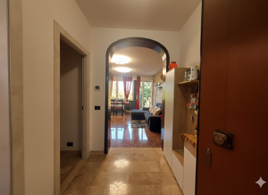 All’ingresso, dotato di portoncino blindato con video-spioncino, troviamo uno spazioso disimpegno, pavimentato con un elegante marmo chiaro. Tale ingresso può fungere da comodo deposito per scarpe e cappotti, grazie ad un’armadiatura multiuso. Il disimpegno si apre su un’ampia zona giorno tramite un arco suggestivo che separa gli ambienti. La stanza, di una dimensione pari a circa 23 mq e impreziosita da un’elegante parete in pietra, ha un’ottima luminosità grazie alla generosa finestra e portafinesta che conduce alla terrazza di 6 mq, affacciata sul verde. L’esposizione della stanza è a nord-ovest.