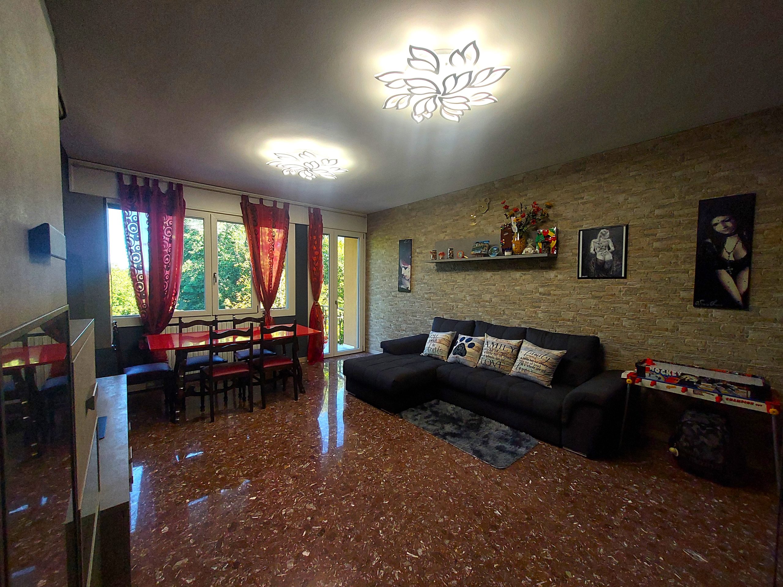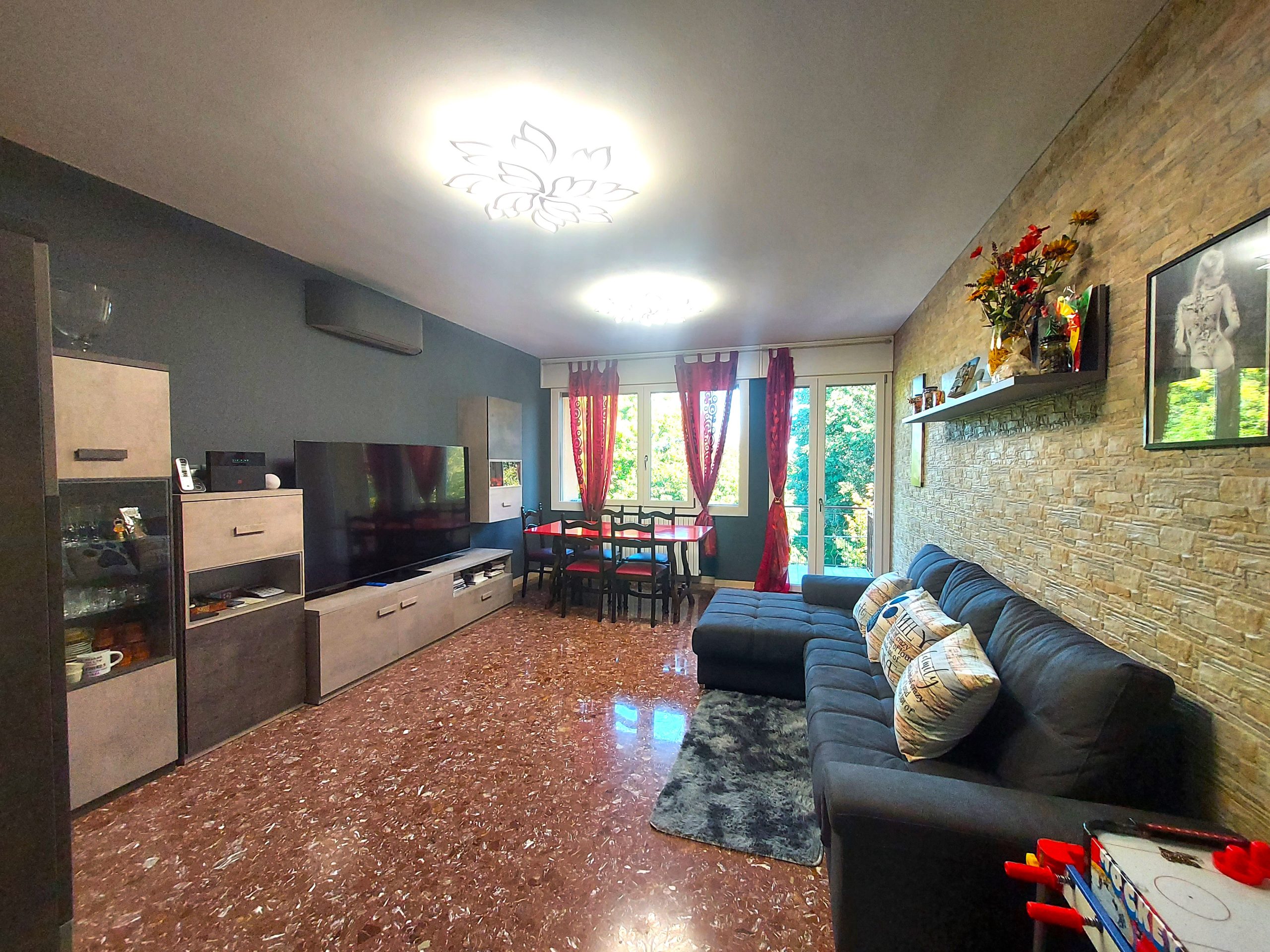 All’ingresso, dotato di portoncino blindato con video-spioncino, troviamo uno spazioso disimpegno, pavimentato con un elegante marmo chiaro. Tale ingresso può fungere da comodo deposito per scarpe e cappotti, grazie ad un’armadiatura multiuso. Il disimpegno si apre su un’ampia zona giorno tramite un arco suggestivo che separa gli ambienti. La stanza, di una dimensione pari a circa 23 mq e impreziosita da un’elegante parete in pietra, ha un’ottima luminosità grazie alla generosa finestra e portafinesta che conduce alla terrazza di 6 mq, affacciata sul verde. L’esposizione della stanza è a nord-ovest.