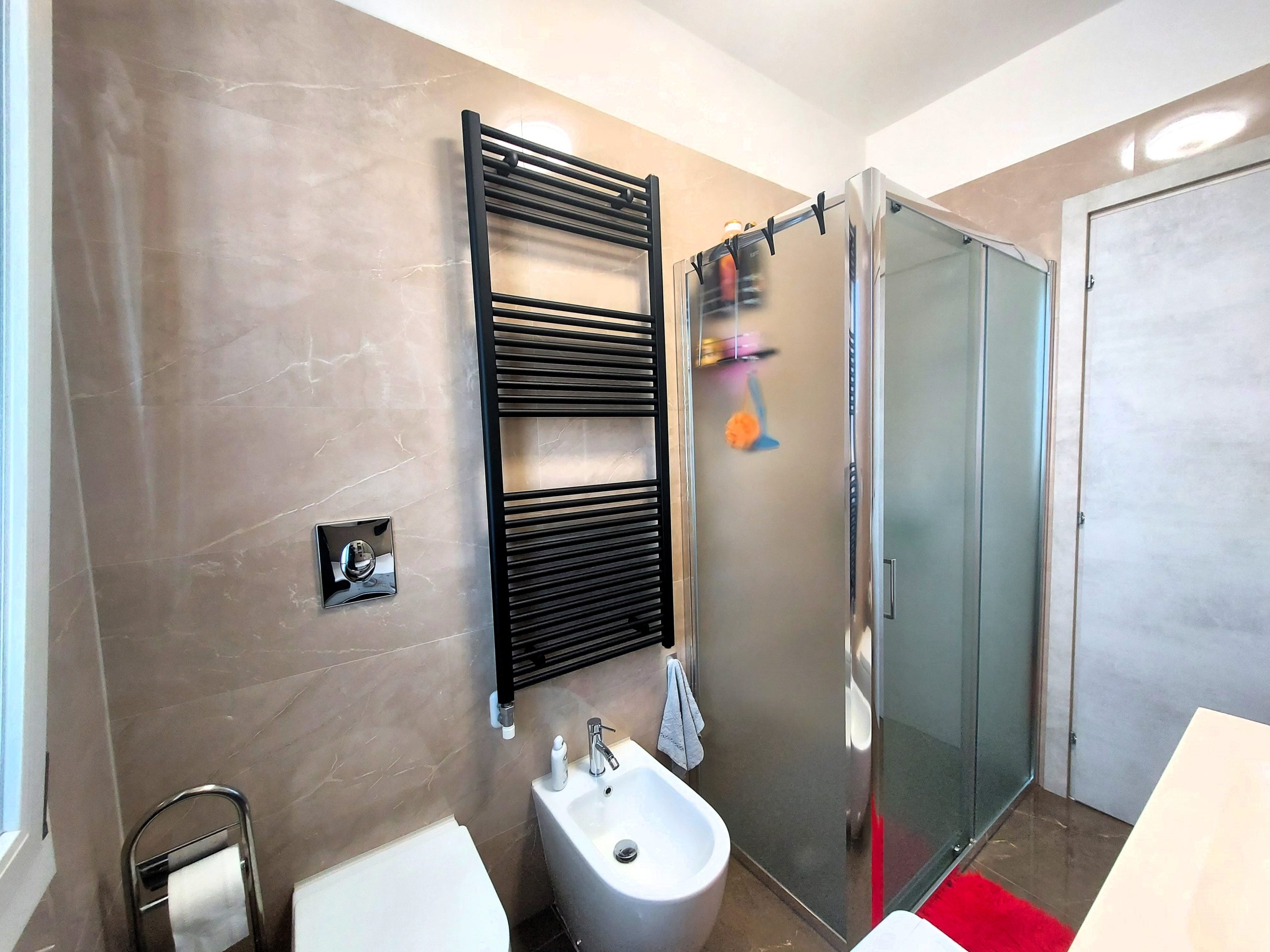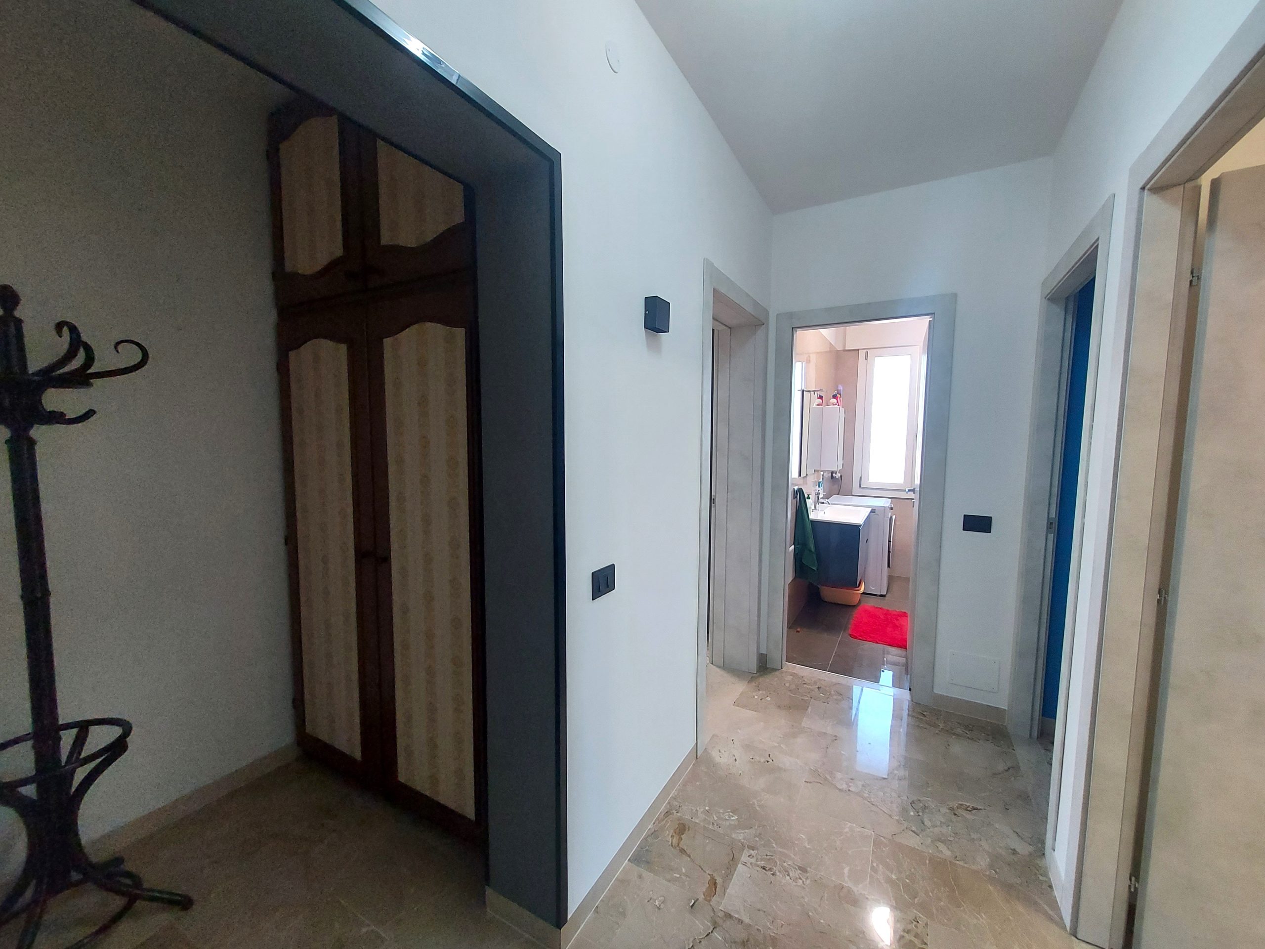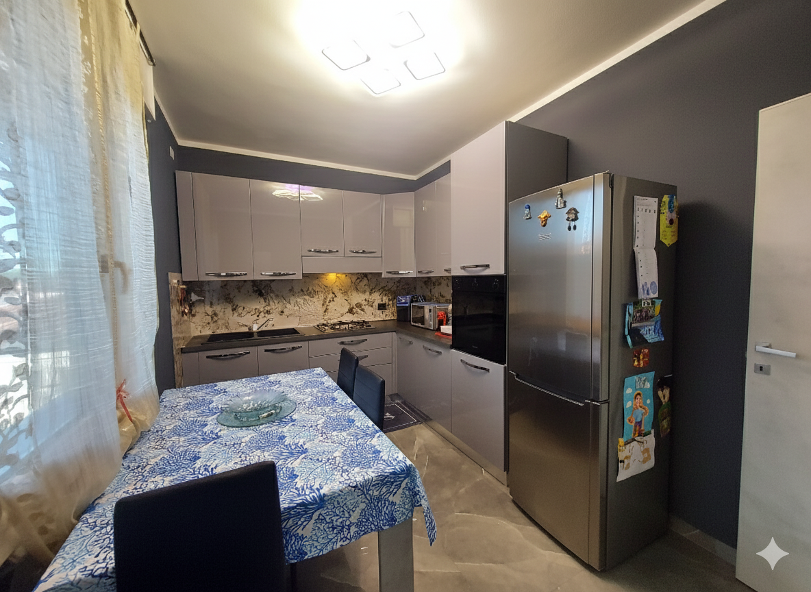 A sinistra dell’ingresso si trova invece la cucina di circa 11 mq, separata e moderna, anch’essa con accesso ad una terrazza di pari dimensioni dell’altra, affacciata però sul cortile interno condominiale, spaziosa ed ideale per stendere la biancheria. La cucina, proprio per la sua dimensione, può ospitare un tavolo per pranzi e cene fino a 4 persone, consentendo una gestione della vita familiare anche per una famiglia con due bambini.